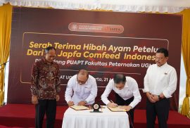 Fakultas Peternakan (Fapet) UGM bersama PT Japfa Comfeed Indonesia Tbk (JAPFA) terus memperkuat kolaborasi strategis dalam pengembangan inovasi peternakan melalui serah terima hibah ayam petelur (layer) sistem cage-free di kandang Pusat Unggulan Antar Perguruan Tinggi (PUAPT), Fapet UGM, Selasa (21/4).