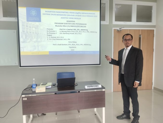 Mustofa Hilmi, mahasiswa Program Doktor Ilmu Peternakan Fakultas Peternakan Universitas Gadjah Mada (UGM), berhasil mengembangkan inovasi pakan unggas berbasis nanoteknologi ramah lingkungan. Dalam disertasinya berjudul “Biosintesis Nanopartikel Perak (AgNPs) Menggunakan Ekstrak Daun Mengkudu (Morinda citrifolia Linn) sebagai Feed Additive Ayam Broiler”, Mustofa membuktikan bahwa nanopartikel perak hasil ekstraksi daun mengkudu berpotensi menjadi alternatif pengganti antibiotik pada ayam broiler.
